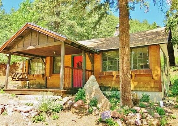 This vintage 2 bedroom, 1 bathroom home has loads of charm but you will not be lacking in amenities here, with a beautifully renovated bathroom and kitchen that includes a dishwasher. A large rustic stone fireplace with insert, plus a supplemental gas heater will keep this place cozy in the cold months. The many multi-pane windows allow for sunny views of the forest. Enjoy the mountain views from the spacious front porch.