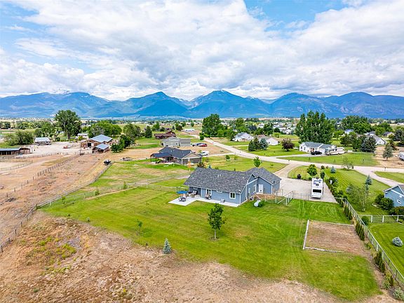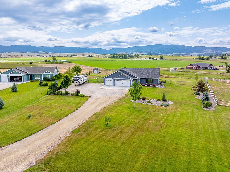 Come explore this immaculate 3-bedroom, 2-bathroom home set on 1.91 acres, perfectly nestled beside wide-open farmland for an extra sense of space and serenity. Designed for effortless single-level living, this thoughtfully laid-out home offers an open floor plan, a spacious primary suite, two additional bedrooms, a second full bathroom and a separate laundry room.  Step outside and enjoy your own private retreat: the backyard boasts a peaceful patio with stunning Sapphire Mountain views, mature landscaping, drip-irrigated flower gardens, and a fully fenced back yard—complete with a separate dog area. It's the perfect blend of beauty and functionality. Located in a quiet neighborhood, you're within walking distance to Ambrose Creek Community Park and just 45 minutes from Missoula—close enough for convenience, far enough for peace and quiet.Additional highlights include: a triple-car garage, RV parking with 20/30/50 amp hook-ups, a 2023 10x20 Bitterroot Shedz wood shed and an underground automatic sprinkler system.Whether you're looking for your forever home or a peaceful Montana getaway, this property offers the space, views, and lifestyle you've been dreaming of.