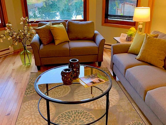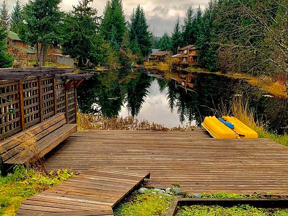 Charming, warm, inviting, view, surrounded by beauty, on a hill overlooking Hidden Lake, in the Hidden Lakes subdivision. Close to recreational trails, tranquil, warm and sunny, watch the ducks as they swim in the lake, paddle around in your paddle boat, watch the sunset off of your private deck, enjoy gardening in the raised and terraced garden bed, friendly family neighborhood. Watch and listen to the avalanches as they roll down Thunder Mountain in the spring, watch the sun rise in the morning, and the sun set in the evening. Two living areas, large kitchen with granite counter tops and back splash, stainless steel appliances, large pantry, hard wood solid core doors, hickory wood trim downstairs. Upstairs you will find three bedrooms and 1 3/4 bath including double closets in the owner's suite with a 3/4 bath, and a full bath for the other two bedrooms to share. Downstairs there is a 1/2 guest bath, living room, dining room/ family room, breakfast nook, covered private deck with skylights, and privacy screening, special area in the fenced backyard.