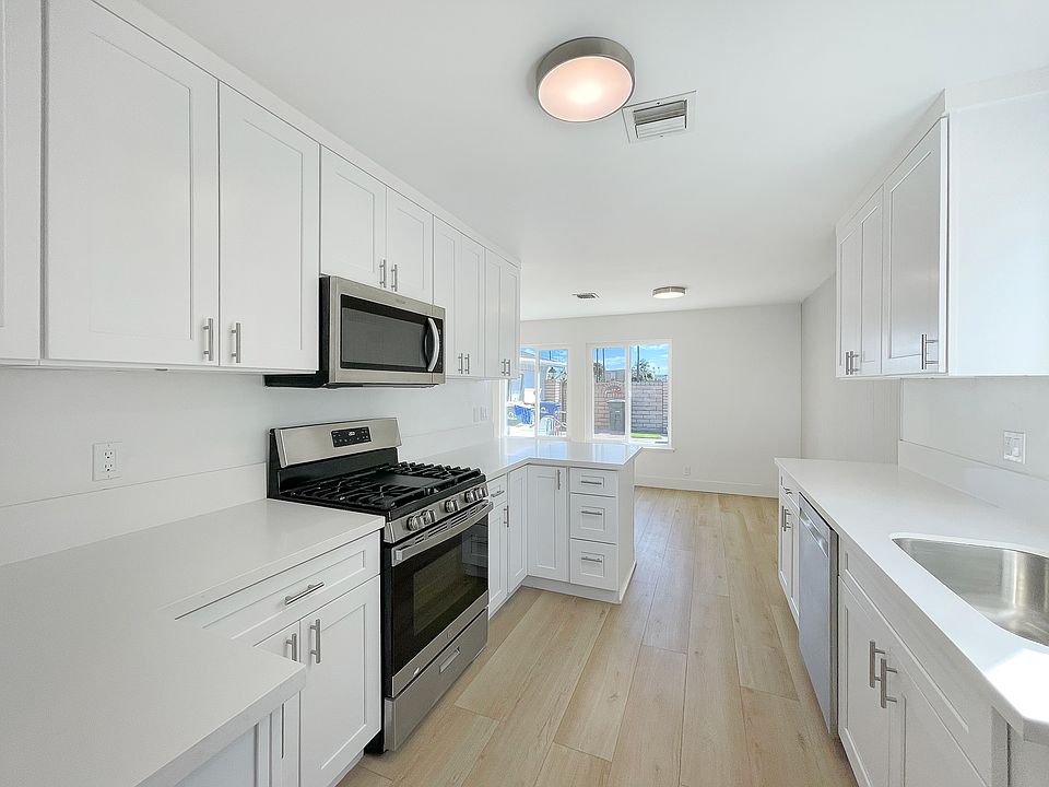 Experience modern living in this newly remodeled Los Alamitos home. This 3-bed, 2-bath residence offers a thoughtfully designed layout, ideal for families, professionals, and students. The home features wide, white oak vinyl plank flooring throughout, complementing the brand-new kitchen with stainless steel appliances. The open living and dining areas provide a functional space for daily life. Both bathrooms have been completely redone with contemporary finishes. New dual-pane windows improve energy efficiency, while central AC and heat ensure year-round comfort. The home sits in a quiet, upscale neighborhood within the highly regarded Los Alamitos School District, offering access to top-rated schools. Located near parks, shopping, and dining, this home provides convenience in a sought-after community. Available immediately, this is a rare opportunity to be the first to live in a fully updated space. Home is detached on a multifamily property. No garage space is included. Driveway space is included.