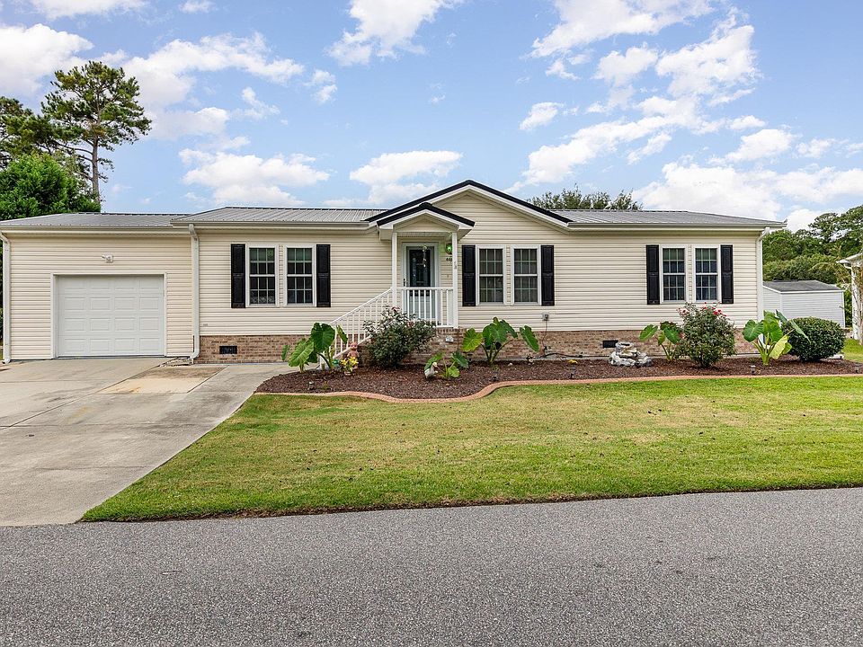 Are you looking for an active 55+ gated community? Country Lakes is a quiet neighborhood just minutes from the beach, shopping and restaurants. The community offers an outside pool, clubhouse, fitness center, billiards, and an activities schedule of events for you to join, if you prefer. You'll have an outside game field that includes bocce ball, shuffleboard, and horseshoes, along with a storage lot for your boat or RV. This 3 bedroom home has a large eat-in kitchen with plenty of cabinets, counter top space, plus you have a pantry. The living room has front windows to let in the sun light. The master bedroom is ample size with your private bathroom, that has a stand alone shower. The other two bedrooms, on the other side of the home, have nice size rooms and closets as well. The home comes with a Carolina room adjacent to your large covered deck. Great spaces to entertain your friends and family. The home is being offered with the all kitchen appliances and the washer and dryer. Refrigerator, range, dishwasher and microwave updated between 2017-2023. New heat/air pump and metal roof installed 2020. Many more items have been updated in this well maintained home for you to see.