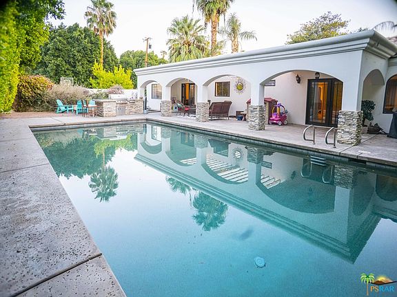 Gorgeous custom home with room for an office! Totally rebuilt from the ground up in 1995. Large beautifully landscaped corner lot with many queen palms on quiet street. Underground electrical. Sparkling Pebble Tec pool and covered rear patio for outdoor dining. Amazing outdoor Koi pond, fire pit and BBQ area with Jenn Air gas grill, sink and fridge. Huge master bath with porthole window, seamless shower doors and jacuzzi tub. Floor to ceiling travertine fireplace w/gas log & starter. Kitchen updated 8 years ago with Thomasville cabinets and farm sink. Double wooden entry doors with beautiful entryway and high clerestory window. Lots of built-ins for artwork, recessed lighting. Inside laundry room, ceiling fans in all the rooms and security system. Double garage with built-in cabinets and work bench. Tiled driveway, concrete mailbox. Close to town center, College of the Desert and El Paseo. This is truly a custom home with wonderful attention to every detail.