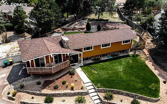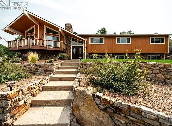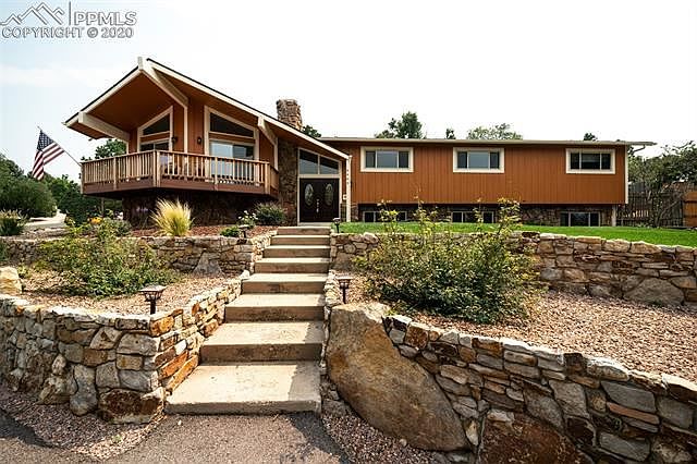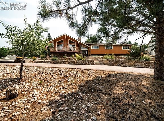 This stunning four bedroom, three bath home sits on a beautifully landscaped 1/2 acre+ corner lot situated in the prestigious area of The Bluffs where one will see deer and wildlife. The property backs to the Homestead Trail for convenient access to serene walks & hikes. This secluded back yard with a 16X13 Trex deck, gazebo, and two adjacent patios (16X13 & 14X10) is awesome for your outdoor entertaining. The wrap around Trex deck in the front is perfect for viewing Pikes Peak. The remodeled gourmet kitchen has beautiful granite countertops, an abundance of cherry soft close custom cabinets with a chocolate glaze finish, double wall oven/convection, & microwave/convection, touchless faucet, and all stainless steel appliances. The gorgeous hickory wood floors expand over the entry, kitchen, dining room, living room, and hallway. The living room features vaulted ceilings, large moss rock gas fireplace, and two sliding glass doors that open to the front deck to view the amazing Colorado sunsets. The large master bedroom features an attached full bath w/double vanity, walk-in closet, two additional closets, and ceiling fan. The conveniently located laundry is on the main level. The huge family room downstairs is garden level with lots of natural light and plenty of room for a pool table and entertainment area. This private corner lot lends to the amazing curb appeal of this property. The impeccably maintained backyard adds to the charm of this wonderful home. This spectacular home is a rare gem convenient to shopping, schools, and parks. All this and much more including replacement of the roof and hot water heater in 2019. All the windows have been replaced and there is Central A/C, humidifier, and automatic sprinklers. Come see this wonderful property.