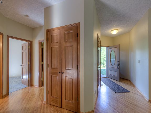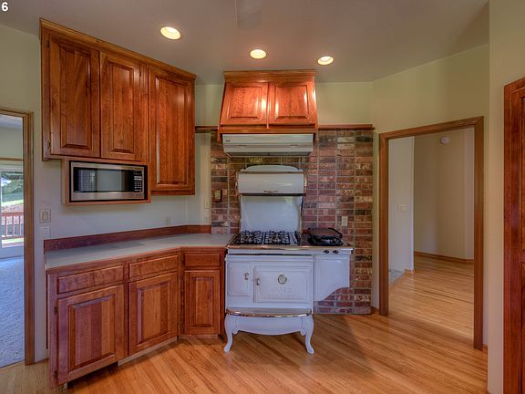Privacy in the Trees. Three bedroom, two bath home up on your own private hill, totaling 3.59 acres. Fresh exterior paint, and refinishing of decks, newer roof (2016), insulation in attic, and under floors. Custom hardwood cherry cabinets and hardwood flooring throughout, oversized garage, two RV hookups, large shop, and beautiful landscaping. Gardening and fruit trees. Live privately in the trees. This is a great family home!