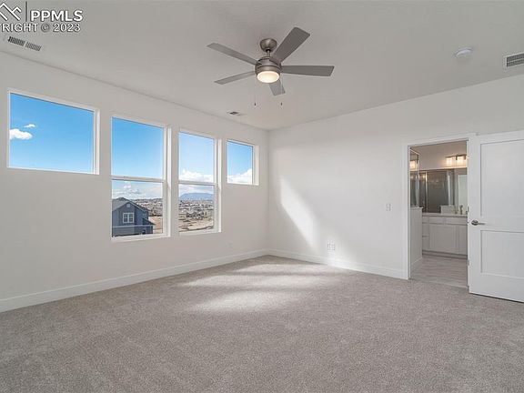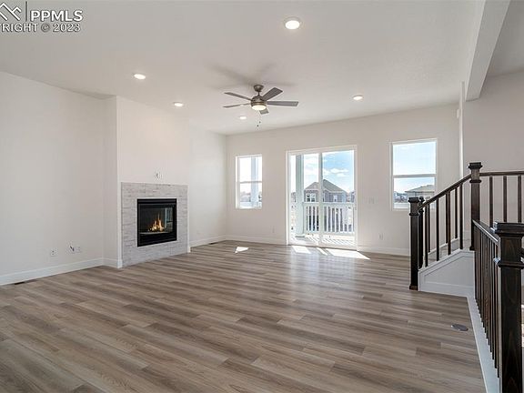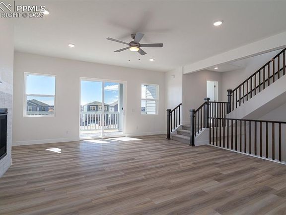 You can live in a luxuriously appointed home zoned for D20 schools and enjoy spectacular views of Pike's Peak. This gorgeous new construction home in Trailside at Cottonwood Creek is nestled in a gated community with easy access to the Powers Blvd. corridor and I-25. The downstairs retreat with 1/2 bath presents a superb opportunity for a welcoming den, workout studio, or the intimate family movie theater you’ve been dreaming of. Upstairs,10-foot ceilings, and soaring, energy-efficient windows allow the spacious open-concept living spaces to shine with natural light. A large kitchen island overlooks a cozy fireplace in the family great room adjacent to the separate dining room and out through the glass doors onto the New Orleans inspired south-facing balcony just beyond. Cook up family favorites or create all new recipes in the tasteful kitchen, featuring 42-inch white cabinets with crown molding a gas stove and Tofino Quartz countertops. The upstairs Owner’s Retreat features an ensuite bathroom with our signature 'Super Shower' and a large walk-in-closet. Two more bedrooms, connected by a full bath and laundry space round out the top floor. Enjoy time on the extensive Cottonwood Creek Trail system connected by a bridge for easy access right from the community. A fully landscaped and fenced backyard completes this home where the HOA maintains all of the landscaping, including your fence-in backyard. Too busy for lawn care? Want to "lock and leave"? Look no further as this community was designed with you in mind!