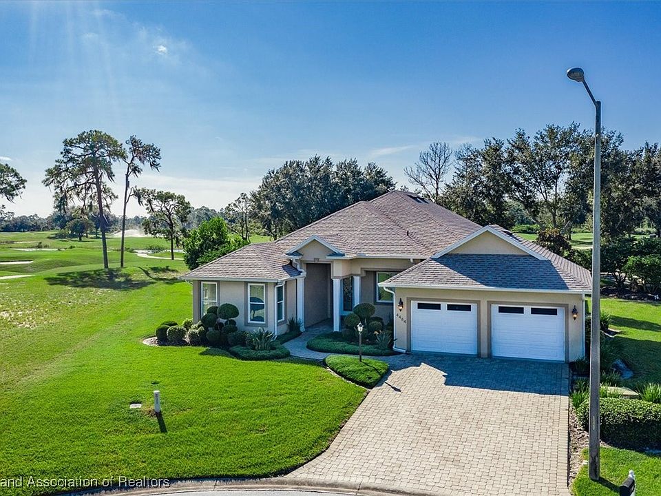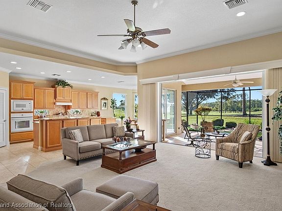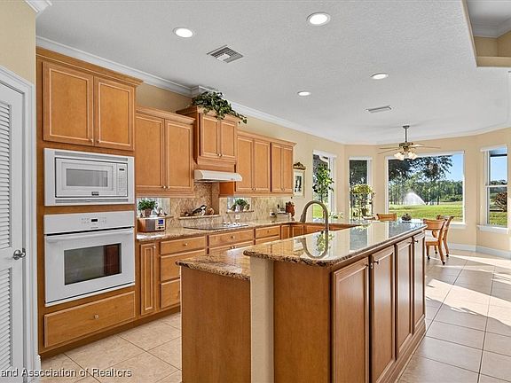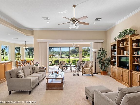 LOOKING FOR AMAZING VIEWS & THE PERFECT SETTING? LOOK NO FURTHER! This custom built, one-owner home has been meticulously maintained and perfectly positioned on a premium, elevated pie-shaped lot at the end of a peaceful cul-de-sac - offering breathtaking panoramic views of the 18th hole and surrounding conservation areas of the Highlands Ridge North Course. From the moment you arrive, the pride of ownership is evident. A paver driveway, walkway, and welcoming front porch lead to a stunning leaded-glass entry door and expansive foyer that opens to a spacious great room with 12' ceilings, crown molding, 8' doors, and panoramic windows that capture sweeping golf course vistas. This home is well-appointed with upgrades & quality features including: *2023 HVAC *2022 roof, hot water tank & gutters *Oversized 2-car garage w/golf cart bay & charging station *Inboard storm room w/bonus storage above *Lush landscaping w/a private irrigation well *Oversized covered lanai + screened area w/artificial turf - ideal for putting practice or pets. The gorgeous kitchen is designed for both beauty and function, showcasing abundant wood cabinetry, granite countertops, a tiled backsplash, walk-in pantry, breakfast bar and large center island overlooking the great room. The adjacent dining area is perfectly situated beside a picture window framing the unobstructed panoramic view. The primary suite features a tray ceiling, two walk-in closets + two linen closets, dual sink vanity, a corner shower, and private water closet. The guest wing, located on the opposite side of the home for added privacy, includes a pocket door, a spacious guest bath, and two versatile rooms - one large enough to serve as a second master suite, complete with a walk-in closet and corner windows that fill the room with natural light and capture both sunrise & sunset views. A generous laundry/utility room just inside from the garage provides extra storage and convenience. Every detail has been thoughtfully designed, but what truly sets this home apart are the captivating views & serene setting. Don't miss your chance to see this exceptional home - it's a true MUST SEE!