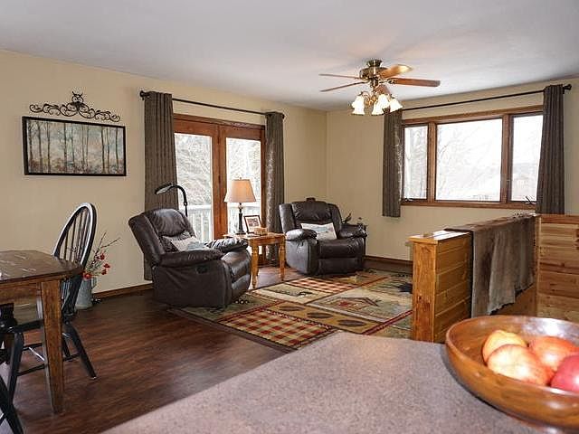 Enjoy beautiful overlook views of the Peshtigo River right from your back door. Or take it a step further and trout fish, canoe and kayak right in your back yard. This nicely kept and cozy home would make the perfect getaway or cozy full time residence. The finished walk out basement covered nicely with some wood and built in shelves, has proven to be great expansion area. Renovations include newer hand scraped, wood look, vinyl flooring, newer lighting fixtures and textured counter tops. The newer two and a half car garage with metal roof comes fully insulated and ready to use for vehicles, toys and your very own generous workshop. Make sure to put this on your list of showings...don't miss out.
