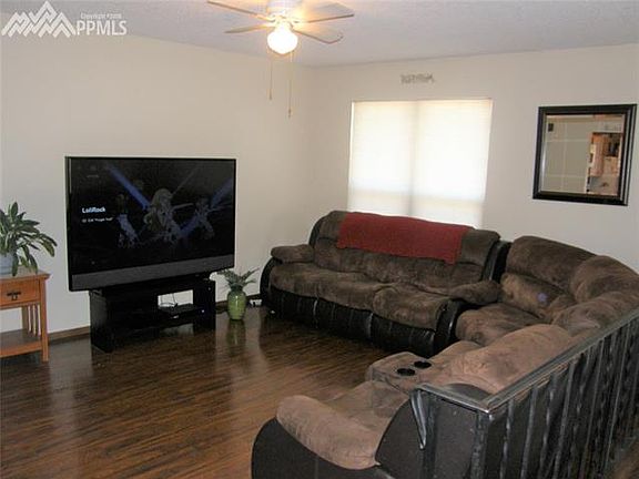 Charming bi-level home offering 3 bedrooms, 2 full bathrooms and a 1 car attached garage with service door to backyard. Walk up to the living room which features a huge window for natural lighting and newer laminate wood flooring. Kitchen and dining room have newer laminate wood flooring plus walk out to 11x27 wood deck. All kitchen appliances stay with the home. Oversized master bedroom has a large walk in closet and a private door to full bathroom. Bedroom #2 also located upstairs offers a walk in closet. Lower level features include a family room with wood burning fireplace, office with french doors for privacy and bedroom #3 which is also oversized has a walk in closet. The second full bathroom with tile floors is combined with the laundry area (washer/dryer stay). Fenced rear yard, shed and mountain views. New roof as of 3/2017 and electrical panel updated as of 11/2003 and newer vinyl windows and a/c for those hot summer days. Close to schools, shopping, restaurants and military bases.
