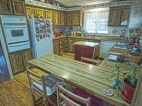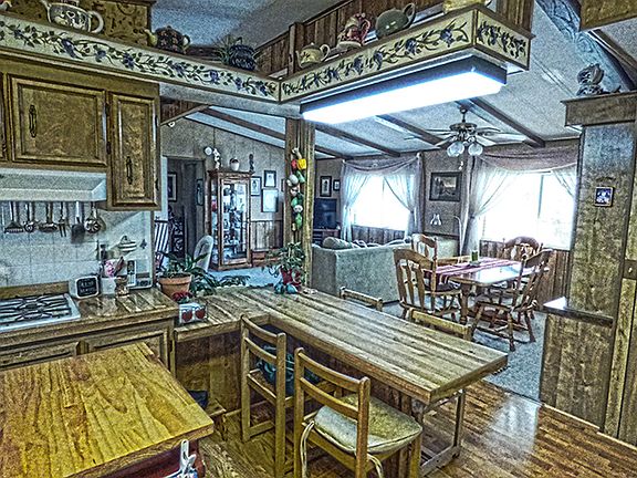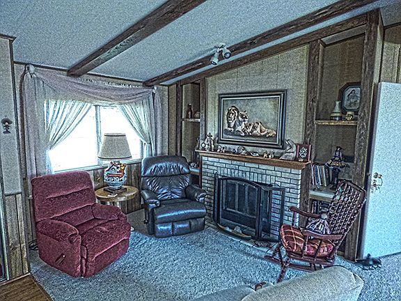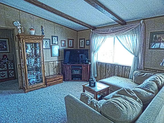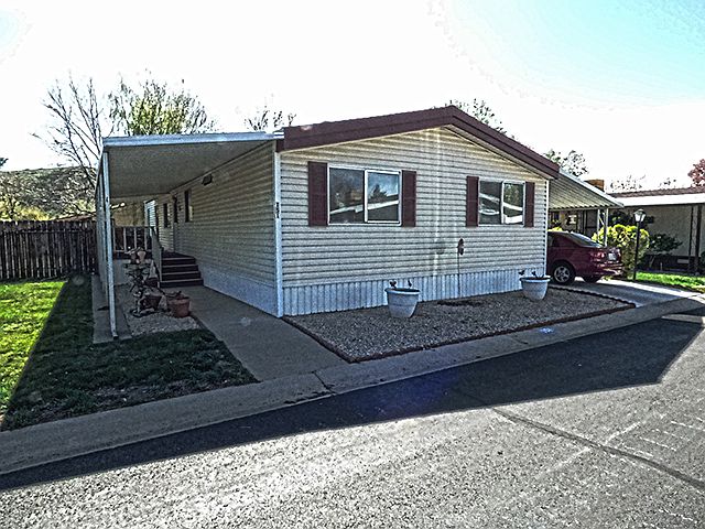 Beautiful home offers a spacious, open kitchen with updated major appliances including a newer wall oven. The kitchen is open to the living space. The wood burning fireplace and vaulted, beamed ceilings create a cozy ambiance. The combination of wood floors, carpet and vinyl are all in very good condition. All bedrooms are good size. The master has a large private bath and walk in closet. The laundry room is huge. Master on one end, 2nd, 3rd bedrooms on the other. Roof, siding, swamp cooler and water heater replaced approx 9 years ago. Covered deck, grassy yard. Garden spot, trees, fenced, storage shed and carport. Lot Rent: 570/mo | Includes: Sewer