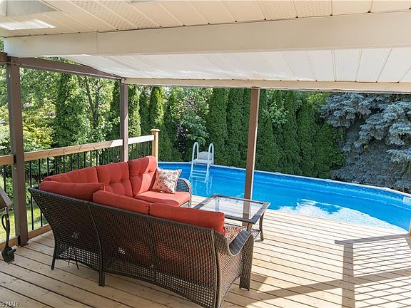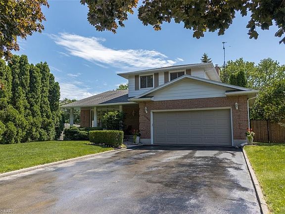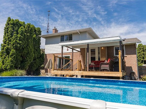 Custom built tri level meticulously maintained and cared for. Sitting on a 170`deep pie shaped lot with a park like setting on a private cul-del-sac, in the most desirable north end of Niagara Falls. This house features an open floor plan with gleaming hardwood and ceramic through out. Vaulted celling and gas fireplace set the stage for a great room to entertain. The lovely oak kitchen with granite counters and breakfast bar over looking the beautiful park like back yard with new covered deck and step down to large patio. The main floor family room has wood burning fireplace and built in oak cabinetry and main floor large powder room with granite. The open staircase leads to the large primary bedroom and full four piece bathroom shared with two other large bedrooms. Down stairs has another three piece bathroom, large laundry room, and fourth bedroom and office, staircase from laundry room leads up to the large double car garage. Central air, central vac furnace, 3 stage water purifier, brand new deck and fencing and over sized beautiful large above ground pool. Truly a beautiful property to call home. 2021-06-18