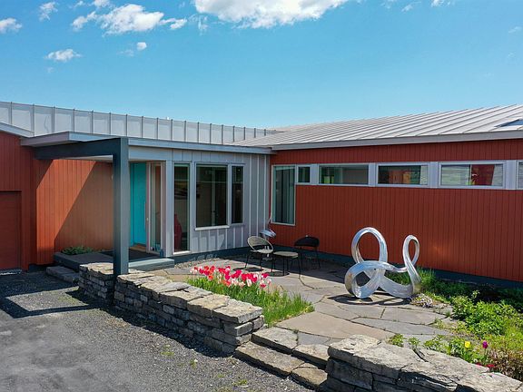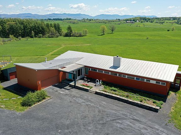 This Frank Lloyd Wright inspired, Architect-designed mid-Century Modernist home is perched on a knoll overlooking bucolic farmland with a Green Mountain backdrop. Sited for year-round passive solar benefits, walls of glass bring the exquisite landscape in at every opportunity. While clean lines and contemporary finishes nod to high style minimalism, there is a casual, utilitarian ease about this home . The Master Suite wing includes a dressing area and bath, screened porch, as well as its own deck with exterior shower. Two additional bedrooms and a shared bath bookend the home via a single open corridor, off of which most spaces open out onto the panoramic view. An open concept great room, kitchen and dining area is expertly configured, with a more intimate sitting/family room adjacent. You'll find convenience in the abundant contemporary built-in shelving and storage throughout, plus practicality and functionality in the pantry, laundry, and guest bath connecting to the attached 2-car garage. Step outside from any one of the screened porches or decks to find privacy, peace and tranquility from every vantage point, including the well-sited pond (a bird-watcher’s paradise), across rolling fields, to the neighboring farms and mountain ranges beyond. A 4 bay garage is an amazing workshop, or boat/vehicle/equipment storage. Downtown Middlebury is less than 20 minutes, while Lake Champlain,nordic and alpine skiing, hiking, and biking are all within 30! Offer deadline of 5/22/23.