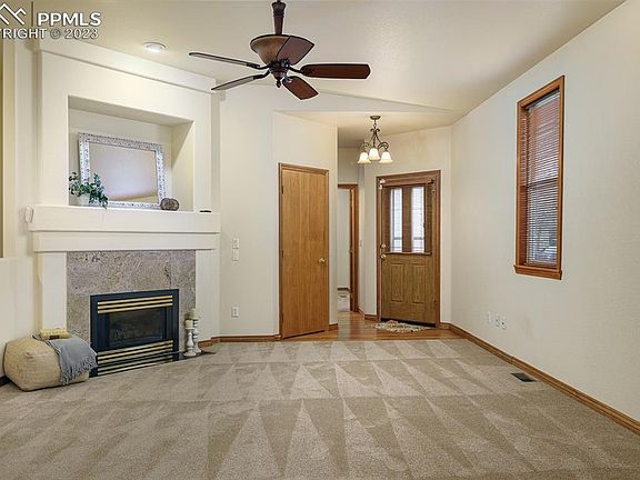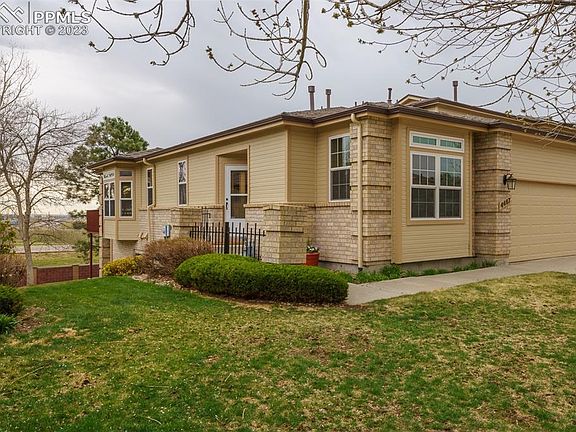 Main level living at its best in an established, maintenance free neighborhood at the foot of Cheyenne Mountain. Fantastic ranch with a wonderfully updated kitchen with corian counter tops, breakfast bar, stainless appliances, gas range, two pantries with pull outs, ample custom cabinetry with pullouts, built in desk, nook with bay window and hardwood floors, walk out to new trex deck. The front bedroom has a beautiful view of Cheyenne Mountain and is off the entry. The living room is cozy with a gas fireplace and dining room is adjacent. Great floor plan for entertaining and also has private family spaces. Primary suite is large and walks out to trex deck. Primary bath has double vanity, custom walk in CA closet, newer tile in shower and space for a tub or to enlarge shower. The laundry room is off the garage and has cabinetry and a custom stainless steel new sink. The garage has a built in workshop desk and cabinetry. Onto the lower walk out level with new luxury vinyl flooring, custom CA desk that is great for hobbies. Wet bar area with corian counter tops, microwave oven, dishwasher and custom cabinetry. Carpeted family room with a walk out to a concrete patio and grass area with pine trees. This is a separate entrance and could serve as a mother in law suite or guest retreat. There is a big bedroom and full bath which complete the lower level.Some of the many features include Pella Windows, Custom wood blinds throughout,New roof & gutters in 2021, new garage doors,furnace, AC unit, humidifier and hot water heater in 2022. Newer ceiling fan in primary bedroom. This home has been lovingly cared for and updated through the years and is completely move in ready. Close to shopping, parks, trails, award winning district 12 schools, Pikes Peak State College, Fort Carson and major arteries. Perfection awaits!