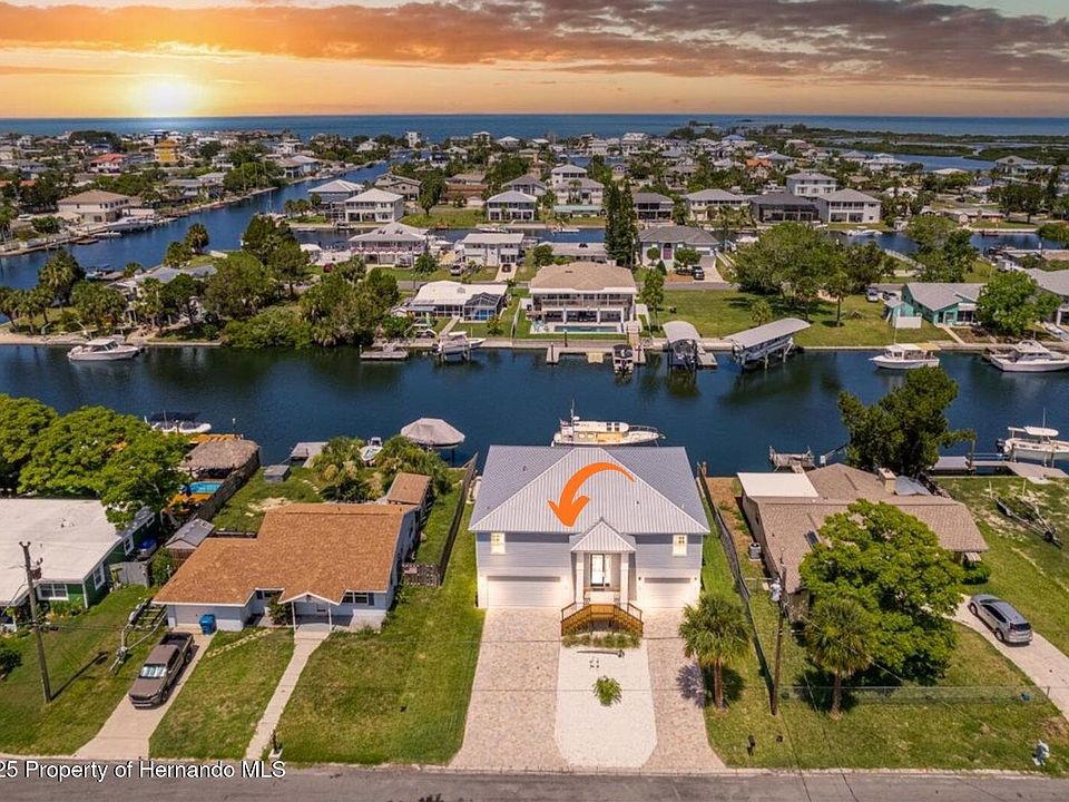 DISCOVER THIS 2023 NAUTICALLY NICE TWO BEDROOM + OFFICE CUSTOM COASTAL HOME IN HERNANDO BEACH. Just Minutes by Boat to the Open GULF and perfectly placed on a Deep Wide Canal with 67 Ft of Seawall + a Floating Dock. Enjoy Ever-Changing Sunset Views, a Private Sandy Beach Area, and Plenty of space to add a Pool, Gazebo or Summer Kitchen to create Your Own Paradise. Step inside to an Open Floor Plan with Vaulted Ceilings, Coastal Finishes, and Designer Touches. The Stunning Kitchen features White Shaker Cabinets, Leathered Granite Counters, Stainless Appliances, a Farmhouse Sink, and a Large Island with Pendant Lighting. Relax on the Upper Porch with Sleek Cable Railings, perfect for morning coffee or sunset cocktails as the coastal breezes roll in. The Primary Suite opens to the back porch and includes a Custom Walk-in Closet, Dual Vanities, and a Luxurious Walk-in Shower. The Guest Suite and Dedicated Office make this home perfect for full-time living, a vacation escape, or short-term rental. Downstairs, the Massive Garage—as Large as the home itself—offers room for Vehicles, Water Toys, and your Dream Workshop. Built to newer codes for peace of mind: Impact Windows & Doors, Metal Roof with secondary water barrier. The home is also PRE-WIRED FOR AN ELEVATOR & already has a Built In Shaft. This Neighborhood allows short-term rentals. With primary low insurance estimates (1,265 for homeowners/wind + 3,945 for private flood however if new owner is paying cash.. FEMA Flood Insurance is Free & Transferrable for Approximately 2 Years), it's not only Beautiful—it's Smart! WHY WAIT TO BUILD? This home is Move-in Ready, Barely Lived In, and Waiting for you to live the CoastaL Lifestyle you've always Dreamed of.