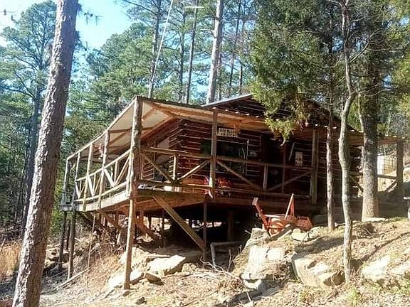 CONTRACT PENDING Get ready to feel like you've stepped into the set of The Mountain Men with this unique property. There is a place for all of your family and friends to find their own peaceful spot of solitude. A lot of creativity and care went into building these cabins. There is a main log Cabin, two guest Cabins, a garage and another outbuilding you could use for just about anything. Believe me you won't want to come off this mountain. The property for sale is in Phase 3 of the Kiamichi Wilderness in Moyers, Oklahoma. This is on the Daisy side in the beautiful mountains of southeastern Oklahoma. The main log cabin is is 20'x24' built in 2016 with the trees off the land. It has an open floorplan with 1 bath.The cabin has a wood stove and a wraparound deck. There are 2 guest cabins. The green cabin is 18'x18' has a kitchen, bedroom,outside batroom and a small livingroom with a woodstove. The 3rd cabin is 12'x12' with an outside bathroom including a shower, sink and woodstove. There is a garage/shop 18'x24' fully slabbed with concrete. Property offered for sale has year-round Buck Creek that splits the land but there is access to each side of the land. No well, we pump water from the creek and utilize rainwater as well. This property is self contained fully off -grid with solar and generators. Everything that goes with this price is 5 generators, 0ne deep freeze, a propane refrigerator, log splitter 2 stoves and a solar system. Also as an added delight there are 2 producing nectarine trees.There is also a small pond on the property. We highly recommend having a 4 wheel drive handy. There are magnificent views of the surrounding area and mountains, Plenty of fish swim in Buck Creek that runs all year-round. This is a hunters haven with wildlife species including white-tail deer, a bear or two, hogs, turkey, rabbits, squirrels and other wildlife native to Oklahoma. Shown by appointment only