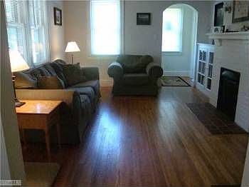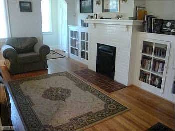 amazing hardwoods, arched doorways, and beautiful glass front bookcase built-ins by brick fireplace