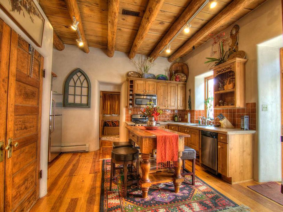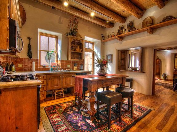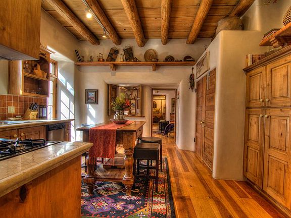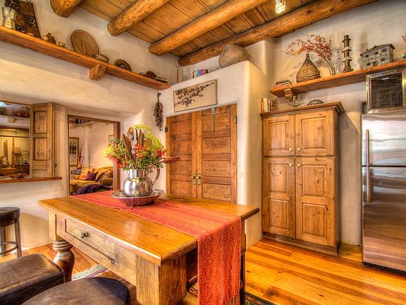 Unbelievable gem! Walk back in time through gated private courtyard and the flagstone steps lead you to a turn-of-the-century single-level double adobe that has been spectacularly renovated with the highest quality by Brian Dunigan. History oozes from the plaster walls, vigas, wood ceilings to the gorgeous wide-planked pine floors. Enjoy the au-currant amenities of the stone kitchen counters, gas stove, stainless appliances, high-quality cabinets, full-size stacked w/d, and insulated windows. Curl up for cozy moments in front of the wood-burning fireplace or enjoy a glass of wine in the courtyard accessible to all rooms. Talavera tile and saltillo floors enhance the charm. Easy stroll to the Railyard or the Plaza. Furnishing are available for purchase, and rental is possible. Fabulous!