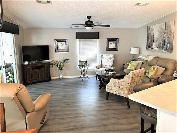 2BR 2BA 1120 sg ft Fully furnished, Newly remodeled kitchen with large island and new cabinets, New laminate floors throughout, newly tiled shower and sinks and vanities, new fans and light fixtures, Windowed and AC in Florida room. Rubber roof and new AC in 2018, Extra Large golf cart shed, large covered carport and front porch, Golf Cart included.