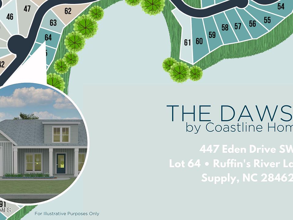 If you missed your chance putting the Dawson under contract on 922 Billy's Dream Circle then here is your chance at 447 Eden Dr! The lot has been cleared and foundation is about to begin. This Dawson will feature a coastal color Victorian Grey vinyl board and batten siding cascading on the front of this home paired with the Victorian Grey lap siding, and large 28 foot by 7 foot front porch. Pull up into the front load 2 car garage of this must see home situated beautifully on a nature lot in the loving community of Ruffin's River Landing. Lovely landscaping and full irrigation will keep your yard looking gorgeous with little maintenance. Come on in through the 2 car garage where storage is not an issue. This long hall gives you access to the upstairs, storage closets for lien or pantry, plus the laundry room, powder room, owner suite and kitchen. This makes it great for kicking off those golf shoes, hanging your fur-baby's leash, or kicking off the beach sand from those flip flops. Throw those beach towels straight into the laundry room, past the powder bathroom at the end of the hall featuring a luxury vinyl plank floor and shelves for storage. Follow the Mohawk LVP Grey Mist flooring into the kitchen where it is matched with white shaker style cabinet with Caesarstone Pebble Quartz Countertops and brushed Nickel hardware. Sherwin Williams Repose Grey and Elder white adorns the walls and Seaworthy coats the front door. This living space is open to the dining room and office space where all these windows allow a soft natural light in. The living room hosts a gas log fireplace and the option to add built-ins around it. Out the backdoor you will never want to leave this 24 foot by 10 foot rear cover porch while enjoying this beautiful nature site that is 100 feet by 150 feet.Owners suite is just a little over 12' x 17' making it plenty of space for a king bed and all your furniture. Your feet will be cozy on the Mohawk Crystal Ball carpet flooring. Into the owner bath there will be Tuscan Villa tile on the floors as well as in the walk-in shower with cultured marble countertops on the graphite cabinets. Separate water closet and large walk-in closet.