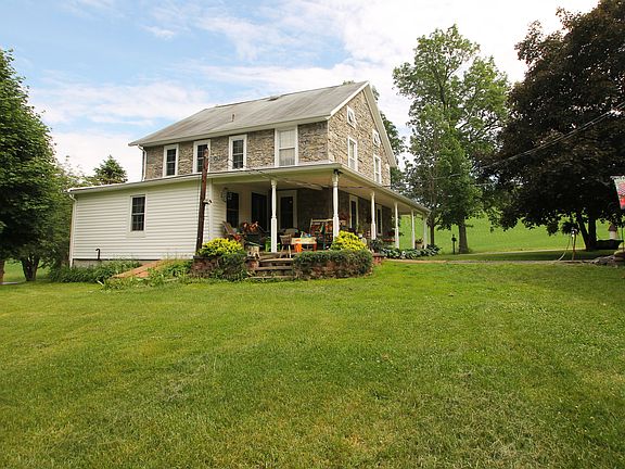 Serene and idyllic, farmette with over 3 acres of meadow-like lawns, with mature trees and fruit trees growing your favorite fruits. In-ground pool, outbuildings, and a wonderful all-stone farmhouse. This farmhouse is in excellent condition and always maintained with care. A large country style kitchen and dining room with original wainscoting, and hardwood flooring. The stone was just meticulous all pointed and all windows are replaced. 2 full baths, 3 bedrooms, full walk up attic and full basement. On the grounds is 2 plus car building/barn with workshops, upstairs and plenty of room for your ATV's, snowmobiles, tractors, etc. There is also a functioning smokehouse. Easy access to RT 33, 209 and 80. The owner lived here for 35 years, did a lot of great work, and is now offering this special home to the public!