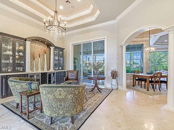 H.15115 This privately situated, 2006 transitional Waterfront home is a Boater's dream. An open, airy design welcomes you to this 3,663-sq. ft home with huge outdoor gathering area. With 4 bedrooms+den & 3 full & 2 half baths, the layout combines function for every day casual living with dose of formality if one chooses to entertain. Upon entering, the volume foyer opens to a dramatic staircase & living area featuring an elegant entertainment center w/ two wine coolers. Home features marble flooring on first floor and hardwood flooring on second and third floors, solid wood doors, & custom millwork throughout. Gourmet kitchen has island, pantry w/ organized shelving, subway tile backsplash, & opens to family room w/ fully pocketing sliding doors leading to massive outdoor living area & water views. Second and third floors occupy three spacious bedrooms all w/ balconies. First floor study offers water view. Master suite has sliders to lanai & bath w/ dual sinks, make up area, soaking tub & large shower. Upstairs landing snack bar w fridge. Dock w/ canopy will house up to 32' boat. Lift capacity is 13,0000 lbs. Hurricane protection & security system. Quick to Gulf and Mercato.