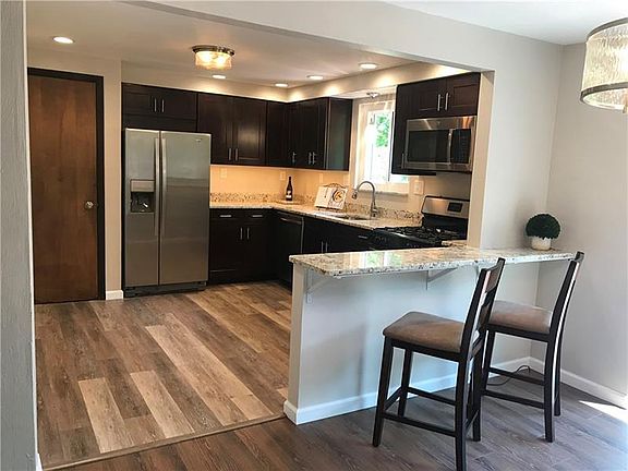 Beautiful private country setting and minutes from town. Meticulously renovated with quality appointments and open floor plan is move in ready. boasts new driveway leading to large two car garage, new doors + opener. Light and bright throughout. completely remodeled kitchen with pantry, granite countertops, espresso wooden cabinets with soft close hinges. New recessed, under cabinet and pendant lighting in the kitchen with the granite breakfast bar make this a show stopper. stainless steel appliances incl. large living room open to the diningrm where glass door leads to an over sized private deck with plenty of space for entertaining! This level contains a completely remodeled full bathroom along with two bedrooms. lower level includes a lovely bonus room with decorative brick fireplace could be used as a family room, private study or bedroom. This level has a second remodeled full bathroom + separate laundry room, new steel door to the garage, windowed door to the back yard.