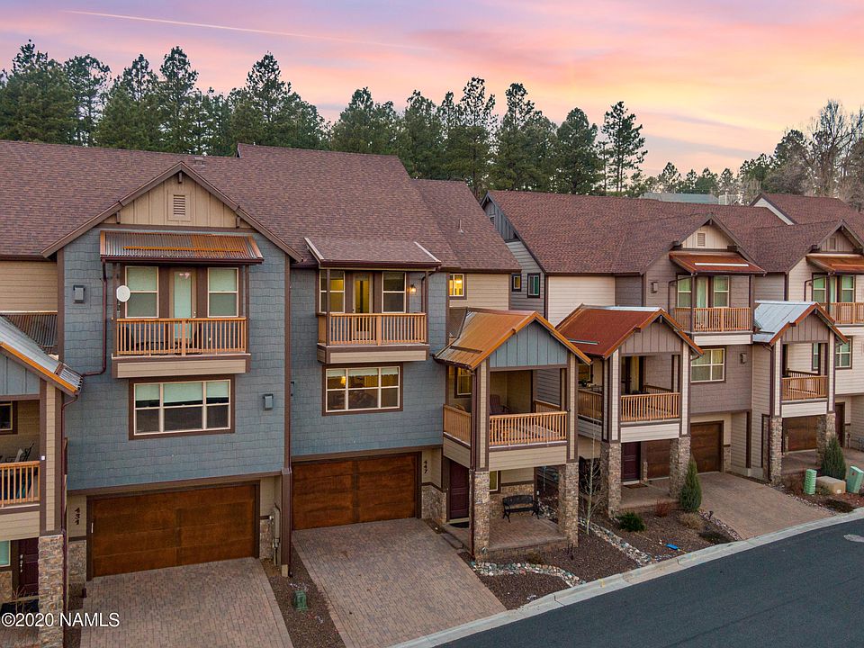 A rare luxury townhome that is centrally located just steps from urban trails and everything Flagstaff has to offer. This 4 bedroom, 3 1/2 bath home is over 3300 square feet in size, has wonderful mountain views and is tucked hillside providing amazing privacy. An elevator ensures accessibility to each level. On entering the property, the main floor provides a large guest suite with en-suite bath, a family room and access to the large back patio or the attached 2 car garage. On level 2 an absolutely spectacular great room opens to a huge, well appointed kitchen and dining space with decks front and back. Just upstairs or a short elevator ride is the large primary suite, with an en-suite bath, its own private deck and 2 guest rooms with a center bath. Don't miss the 3D virtual tour.
