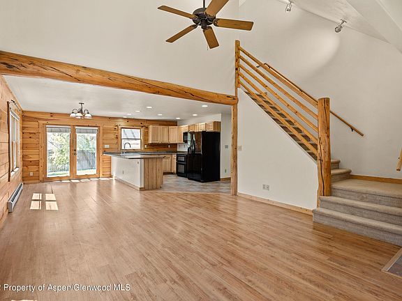Classic Colorado log home with a warm ''woodsy'' ambiance. Fresh interior paint throughout, ceiling fans, cozy gas heating stove in living room, new TREX deck, fenced yard, automatic sprinkler system front and back, two car garage with alley access and a welcoming covered front porch with swing from which to visit with the neighbors and watch the world go by along this quiet avenue. One bedroom and full bath on main level, plus two en-suite bedrooms upstairs. Extra-large laundry/mudroom adjacent to garage, with washer/dryer included. Garage has shelving and cabinets for storage, and additional storage above via pull-down ladder. Vacant and move-in ready!