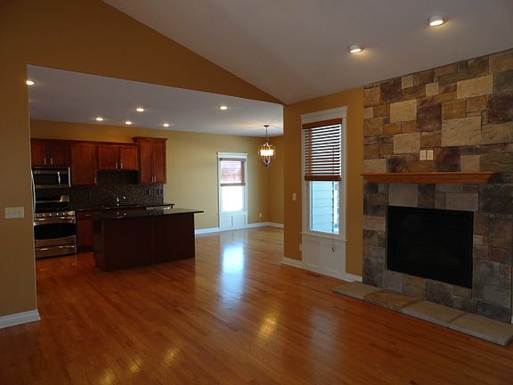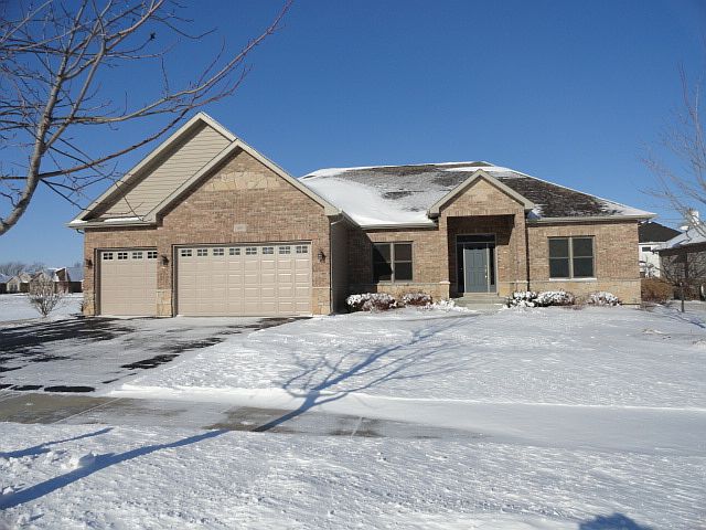 ELEGANCE & WARMTH ABOUNDS IN THIS "CUSTOM" RANCH HOME WITH FINISHED BASEMENT. Stone & brick accents, plentiful landscaping, backyard patio, fire pit & black aluminum fencing embrace with lovely Bridges of Rivermist property. 2 stunning fireplaces, solid 7' luxury interior doors, hardwood flooring, rich color schemes, upscale lighting, volume ceiling & transom windows offer amazing ambiance. Sun-filled foyer welcomes you presenting wall sconce & wrought iron staircase. Kitchen features tiered maple cabinets w/ crown molding, granite tops, 2 pantries, bbar & glass tiled back-splash. Great Room showcases clean face stone fireplace. French doors open into 1st level office! Master Suite displays stacked stone fireplace & window mill-work detail w/ 2 sinks, tiled whirlpool, wide shower & linen closet in master spa! Finished basement comes equipped w/ white doors & trim, recessed lighting, 4th bedroom, huge family room, 4th bathroom; hobby, game, play rooms & 93.5% efficient furnace!