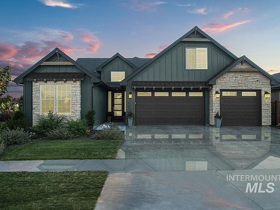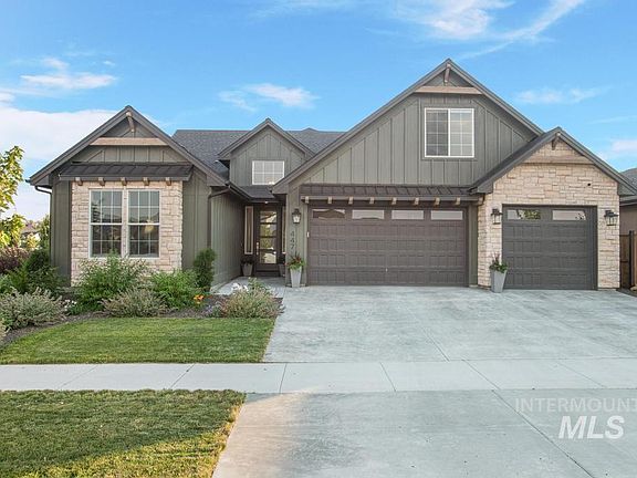 Welcome to your dream home! This stunning 2 story 3200SF home lives like a single story and has no rear neighbors. Step inside to a large entry with 11 foot ceilings that opens up to the great room and kitchen. Imagine entertaining in your chef's kitchen with double ovens, 5 burner gas cooktop, and spacious kitchen island. The light and bright great room features large windows and a cozy fireplace. Watch the sunset on your patio with a beautifully landscaped yard and raised garden beds. Unwind in the main floor master suite with dual vanities, a large soaker tub & walk in shower. Split bedroom floorplan with two more bedrooms and an office on the main floor. Upstairs is another bedroom, bathroom, and a spacious bonus room. The 3 car garage has coated floors and a 75-gallon water heater. Custom wood work throughout. Riverstone is a gated community featuring resort style living with a pool, gym, bocce ball court, walking paths, access to the Boise River, and beach club for kayaking, paddleboarding and swimming.
