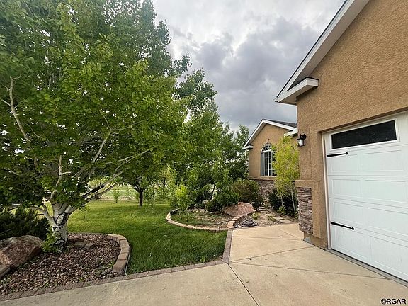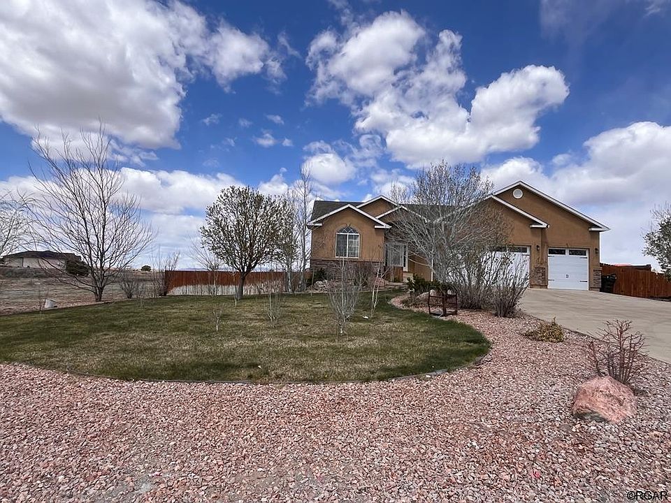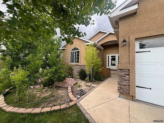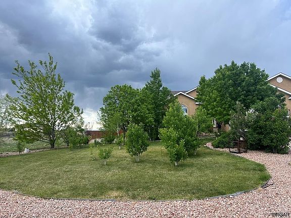 Welcome home to your expansive Pueblo West Rancher. This home boasts 5 large bedrooms and three bathrooms, with an open living, kitchen, and dining space. Solid white oak floors with a Brazilian cherry border are in the living room, hallway, and primary bedroom. Enjoy the gas fireplace on those chilly Colorado days. The kitchen has a large island, dark stainless appliances, ample cabinet space including pan drawers! The large trex deck has both covered and open space. Just down the hall is your main level laundry and private primary bedroom. There is plenty of space for large furniture in addition to the walk in closet. The primary bath has a jacuzzi tub and separate shower. Down the stairs is an entertainers dream. This finished basement has a wet bar with two fridges and is wired for a home theater surround. Two more bedrooms, bathroom, and utility area with a Rinnai on demand water heater finish off the basement space. But that's not all this home has to offer. Outside you have manicured front landscaping, circle driveway, front and back irrigation, three car garage, sheds, and fully fenced back yard. The backyard is sprinkled with multiple raised garden beds for all your gardening needs. The property has Aspens, Ponderosas, Blue Spruces, Lodge Pole Pine, Choke Cherry, Flowering Pear, Mugo Pine, Lilacs, Cottonwoods, and a Weeping Willow. Backyard has plenty of room for additional outbuildings and RV parking with drive through capability. Come see it for yourself!