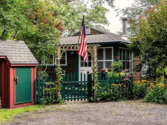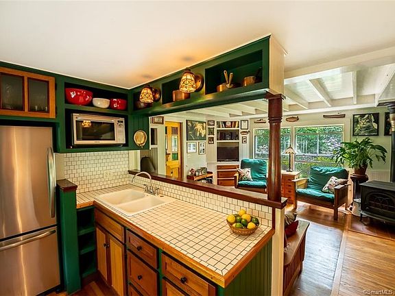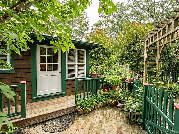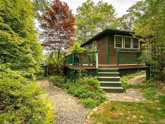 Enjoy the serenity of country living with the convenience of Mystic being only a few minutes from your doorway. This country oasis glistens with hardwood flooring throughout leading to a rear open deck overlooking the expansive yard area and distant pond. This one bedroom home can easily accommodate overnight guests with a sleeper sofa in living room area or artists studio/den. Kitchen area overlooks rear fenced in yard area ideal for letting pets run free and snipping off the freshness of home grown garden parsley while preparing the latest culinary delight. Interior wainscoting, chair rails, stain glass pocket doors, custom built-ins, corner cabinet all included. Gardens surround this cottage gem with annuals and perennials in continual bloom during the growing season. The heat fueled by wood stove and baseboard electric. Outdoor exterior has easy care red cedar shakes, potting shed that would make even Martha Stewart envious, and basement walk-out which is currently used as a wood working shop. Home is convenient to I95 making it an easy commute to Electric Boat or Pfizer employment. Enjoy easy access to Rhode Island beaches, two of the world's largest casinos, and a multitude of Mystic's dining, shopping and entertainment amenities. Enclosures for wood storage and recyclables blend nicely with the property. Stone walls frame the 1.4 acres. This home is the perfect get-a-way home or private retreat for those seeking quiet enjoyment in the great outdoors.