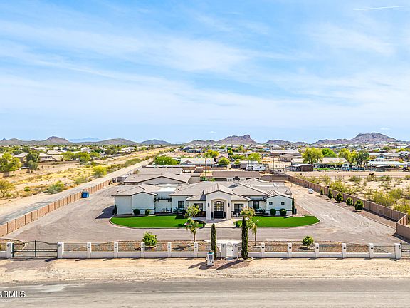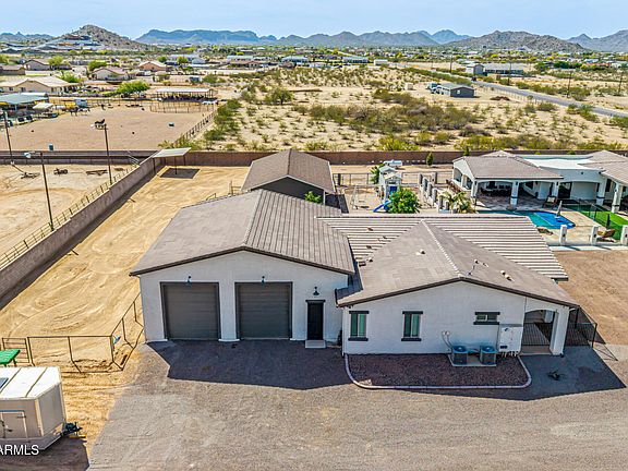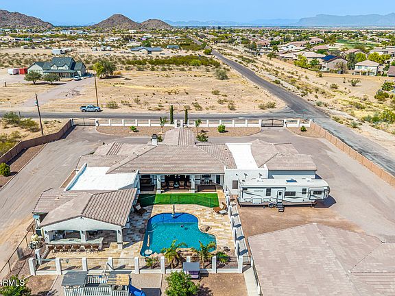 Your private resort and ranch combined—this gated 2.03-acre San Tan Valley estate has it all, with no HOA. The 4,100 sq ft main home offers 4 bedrooms, 3.5 baths, a chef's kitchen with butler's pantry, open living with a stone fireplace, a spa-inspired primary suite. A 1,703 sq ft guest house adds 2 bedrooms, 2.5 baths, full kitchen, private laundry. The detached 1,967 sq ft climate-controlled RV garage/workshop features oversized clearance, a half bath, and 16'x20' bonus tool room/gym. Outside, enjoy a pool with grotto, waterfall, outdoor kitchen, patios, and pool bath. Horse amenities include a 800 sq ft (40 by 20 ft) barn with two 10x10 stalls, and a fenced arena.