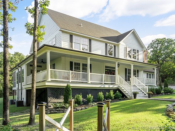 Incredible custom-built farmhouse on 15 acres with a pond! This 4-bed home gives you the feel of the Ozarks but within 25 minutes of Tulsa. The open floorplan provides great views of the country and windows surround the kitchen, dining room, and living area. A second living area could also serve as a formal dining room. Also downstairs, master suite includes vaulted ceilings, a fireplace, and a huge master closet! The master bath features a soaking tub and a separate walk-in shower. Additional bedroom downstairs offers great guest room. Upstairs features 2 bedrooms and an additional living area with Jack and Jill bathroom, along with a hobby/craft room, and additional storage. Also featured upstairs is an incredible music room with amazing views! This house has everything! Enjoy nature from a porch that wraps around three sides of the house, with a separate screened-in porch, a stocked pond, and beautiful hills/rock formations. *to have accurate directions, use 4470 E0801 Rd. Mounds, OK 74047.