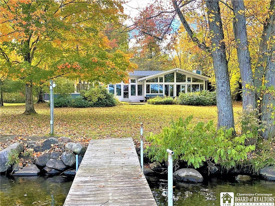 This lovely 4 bedroom 3 bath home is tucked away in an exceptional, very private setting, with just over an acre, 160 feet of lakefront & a private dock... There’s nothing else like it on the market! Privacy & serenity abound in this park-like setting with mature shade trees and impressive space between your & your neighbors’ docks. The house is open & airy, designed with tall ceilings & nothing but windows on the lake side for beautiful lighting & incredible lake views. Everything is convenient on one floor. The main living area features a remodeled kitchen, custom built-ins surrounding the beautiful stone fireplace, & patio doors leading to a large deck. 3 bedrooms are at one end of the house, one with its own spacious, updated bathroom. A nice, big bedroom on the opposite end with a walk in closet & adjacent full bath adds over 300sf to the square footage. A charming sunporch opens onto a stone patio overlooking your peaceful back yard. This is one of the largest lots in the Chautauqua Shores community, with plenty of room to expand, or a possibility to subdivide. A special bonus is the convenient paved path for quick, safe & easy access to Chautauqua Institution!