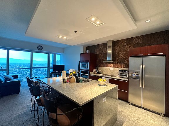 Strip and mountain viewsDual sinksFloor-to-ceiling windowsModern kitchenStainless steel appliancesBreakfast barSeparate shower