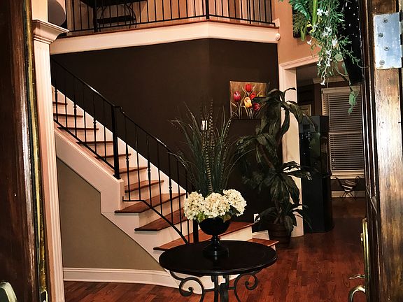 The kitchen offers granite, travertine back splash, double ovens, gas cook top, warming drawer, extra deep sink & tons of cabinet & counter top space. Beautiful, true hardwood floors in all living areas & bedrooms with exception of master. Office with built in shelving & French doors, formal dining room & butler’s pantry. Spacious master bedroom with private front porch & pocket doors leading to connected office/nursery/reading or workout room. Luxury master bath with tile floors, 2 sinks, soaking tub & separate shower. His & her walk in closets. Tons of storage & closet space throughout. Smooth ceilings, built in’s, recessed lights, 2” blinds & lots of crown molding throughout. Separate laundry room with freezer space. Upstairs bedroom could be 2nd master w/private bath & walk in closet. Covered back patio & pool with gazebo. Extra deep 3 car attached garage with built in storage & sink, plus 1 car detached garage w/upstairs storage. 220 & room for expansion in electrical panel in detached garage. Extra parking pad in front plus additional parking for an RV with double gate. Two HVAC systems & hot water tanks.