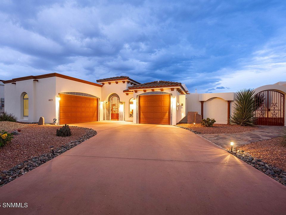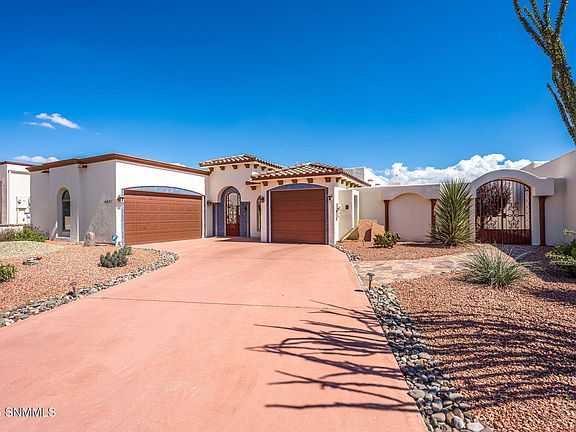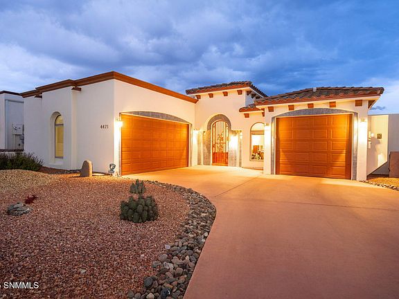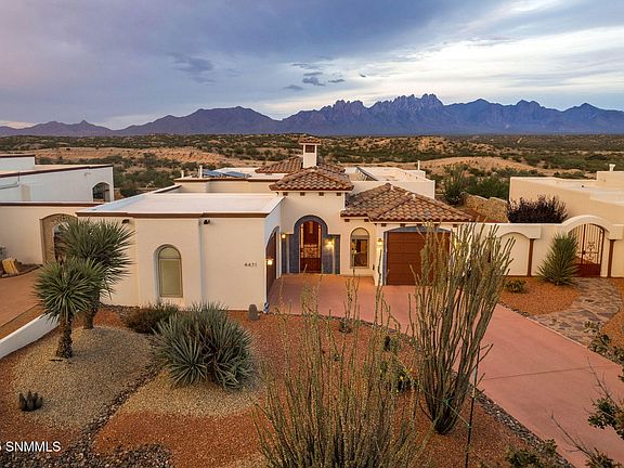 Step inside this stunning custom single-story home located in the highly desirable gated community of Pueblos at Alameda Ranch in Las Cruces, NM. Built in 2007, this impeccably maintained residence offers 2,400 square feet of refined living space on a generous one-third-acre lot. Designed with both comfort and sustainability in mind, the home features two spacious master suites, each strategically positioned to capture southern light for maximum energy efficiency, is a third bedroom or office, each with walk-in closets, and three full bathrooms, including a powder room with a steam shower and marble vanity. The formal dining room is a true showpiece with tongue-and-groove ceilings, hardwood floors, and four cast stone columns. A gas or wood three-way fireplace anchors the spacious living room, which also boasts breathtaking views of the Organ Mountains framed by wood casement Pella windows.