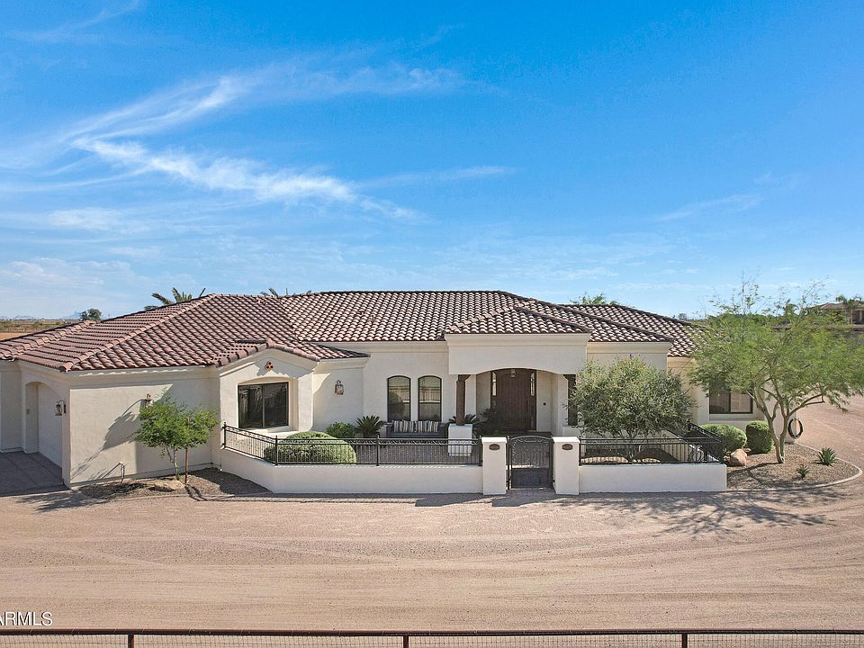 Truly a ''ONE OF A KIND'' Custom Horse Property on 6+ irrigated acres in upscale equestrian neighborhood. 3300 Sq Ft. Main house features 4 bedrooms/2.5 baths ,with wood flooring everywhere.The island kitchen is a master piece, granite counters, huge breakfast area, all stainless steel Kitchen Aid appliances, Knotty Alder 42'' cabinets. 9' doors, Large family room with flagstone fire place. Shutters & window coverings throughout. Den/Game room, wet bar, 4 car garage. Plus 784' guest house complete with kitchen/laundry & 1 car garage. Beautiful Backyard for entertaining with sparkling pool, pavered decking, heated spa and block fence. Outside this property has an 8 stall barn, Fans/Mist auto water's, tack room, covered parking for tractor & RV, irrigated pastures with shade(s) A MUST SE