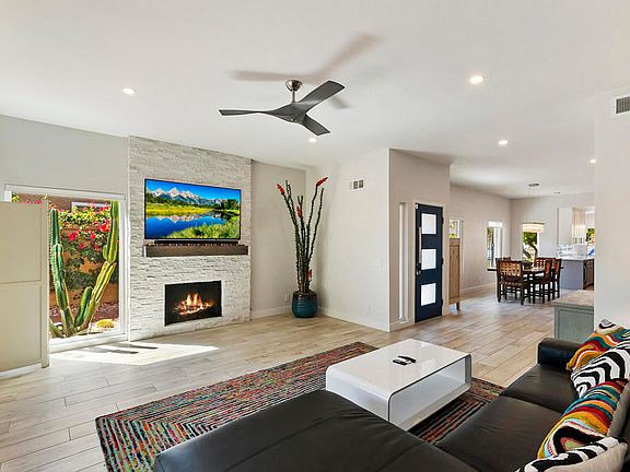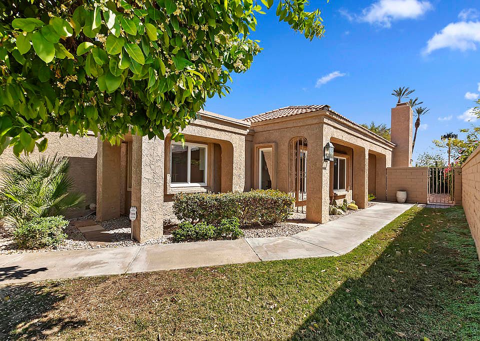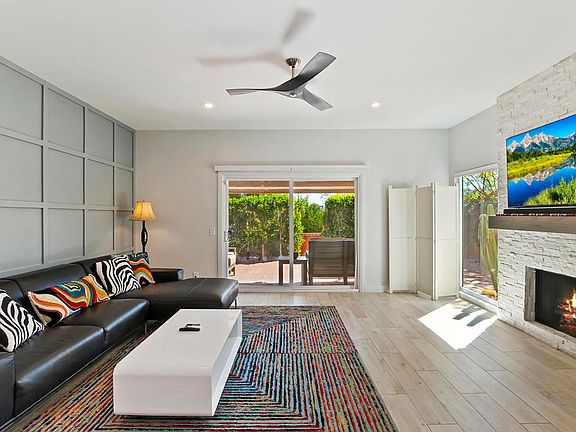 This stunning 3-bedroom condo in South Palm Desert has been completely remodeled and upgraded to the nines, making it the perfect place to call home. Its prime location is just a short stroll from shops and the vibrant El Paseo means everything you need is right at your fingertips. The kitchen is a chef's dream, with a large farmhouse sink, brand-new modern cabinetry, high-end GE appliances, and stunning white quartz countertops. The living room features beautiful paneling, a modern fireplace, and integrated TV. The master bedroom is an oasis with integrated ceiling speakers and a paneling backdrop wall. The master bath is equally stunning with double sinks and a large modern freestanding soaking tub. The two additional bedrooms are separated by an open-air atrium, adding a touch of nature and serenity to the space. The private back patio is enclosed by 12-foot-high Ficus hedges and faces east, providing optimal orientation and natural light. This condo has incredible energy and feels that you have to experience for yourself. Don't miss out on this amazing opportunity to live in one of the most desirable locations in South Palm Desert!