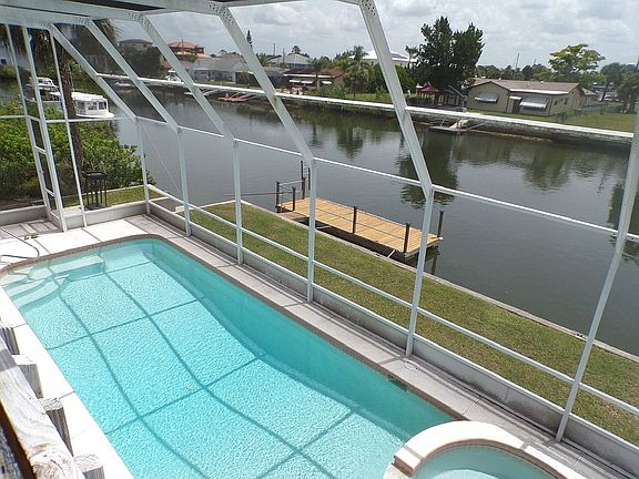 Make this 2,387sf open concept stilt house, situated on a 6,534sf lot, your next home. The upper living area has 3 bedrooms, 3 full baths, laundry, great room with propane fireplace, dining room, and eat in kitchen. All windows have 3M hurricane protective film. Downstairs provides another 2,387sf of space which includes a bar area, workshop, 3+ car garage, and a nice area for a future game room / den. Back of home includes a high sea wall with steps to the boat dock, a screened in covered lanai enclosing the upgraded salt water pool, with a jacuzzi. Extra parking was added for a boat or RV. The roof was replaced 4 years ago and completely covered with a rubberized asphalt adhesive laminate, also a wind mitigation was performed 3 years ago that saves you about $1000/yr on home owners insurance. Priced very reasonably for the area, needs some updating if you want, but you can move in right away ‘as is’ and update at your convenience. Disclaimer: jacuzzi propane heater does not work. The pool deck needs to be resurfaced and the tile around the pool needs to be re-grouted. The AC / Heating unit is 13 years old, but works fine, the four-zone AC/Heat needs to be repaired (AC/Heat works perfectly without the zones). (Seller pays 3% realtor commission at closing.)