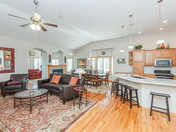Attractive ranch on a corner lot with many updates and a serene view of green space & neighborhood pond. Remodeled kitchen includes large counter-height island/breakfast bar new granite countertops, new gas stove,new microwave. Double-sided FP, separate sunroom & living room. Master suite w/glass drs to deck, trey ceiling, walk-in closet, double sinks, jet tub, tiled shower. Hdwd flrs, 10 ft ceilings, open plan, open staircase, plantation shutters. RO water filtration water, water softner,built-in speakers.