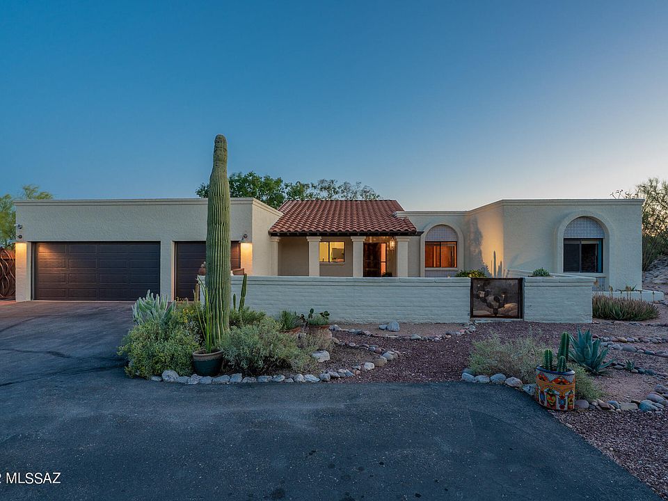 This stunning hacienda sits atop a hill and has the wonderful quality of peace with luxury. Two large living areas with a dining area between and a farmhouse style kitchen with wooden butcher block counters and open shelves are complimented by a fantastic view of the beautiful Catalina Mountains. Classic Mexican tile compliments rustic wood with wall to wall hardwood floors and updated ameneties make this house a gem you do not want to miss. Step outside to a peaceful oasis with large shade trees and a crystalline pool that grants spanning views of the city, desert, and mountains. Cap it all off with a three car garage and you cannot afford to miss out on this one.