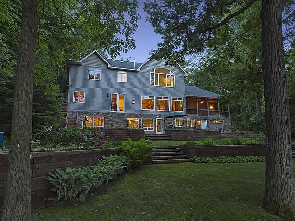 Directions I-694 to MN-5, E on 34th St N, N on Ideal Ave, home on right., Nestled amongst natural surroundings & the sparkling waters of Lake Olson, this 2-story home has a thoughtful design & open concept ML w/a breezy aura & flow. Durable & virtually indestructible heated tile floors & large picture windows showcasing inspiring views throughout. Remodeled kitchen & baths, ML BR & en suite, 3 BRs on UL including gorgeous master suite w/vaulted ceiling, fireplace & stunning bath. Ample garage storage & huge paver patio, fire pit & dock overlooking the lake in back.
