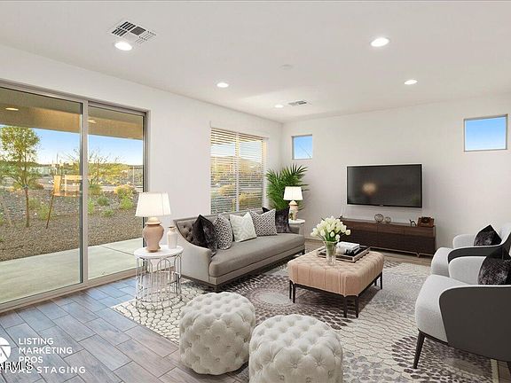Includes 2 power shades for the patio in your choice of colors (within HOA guidelines). Newly ADDED Kitchen Backsplash! Landscaping on this BRAND NEW FLOURISH has been completed! 3 bed/2 bath with a DEN. Beautiful wood look tile in all main living areas, upgraded carpet in bedrooms. Kitchen has Quartz Slab Counters, SS appliances, Under Cabinet LED Lighting, and Pendant lights over the large center island. Owners Suite w/Double Sinks, Spacious Shower and Large Walk-in Closet. 2 Guest Bedrooms at the front of the home and a centrally located Den. Garage floor with beautiful epoxy paint. Corner lot with lots of common area to enjoy!