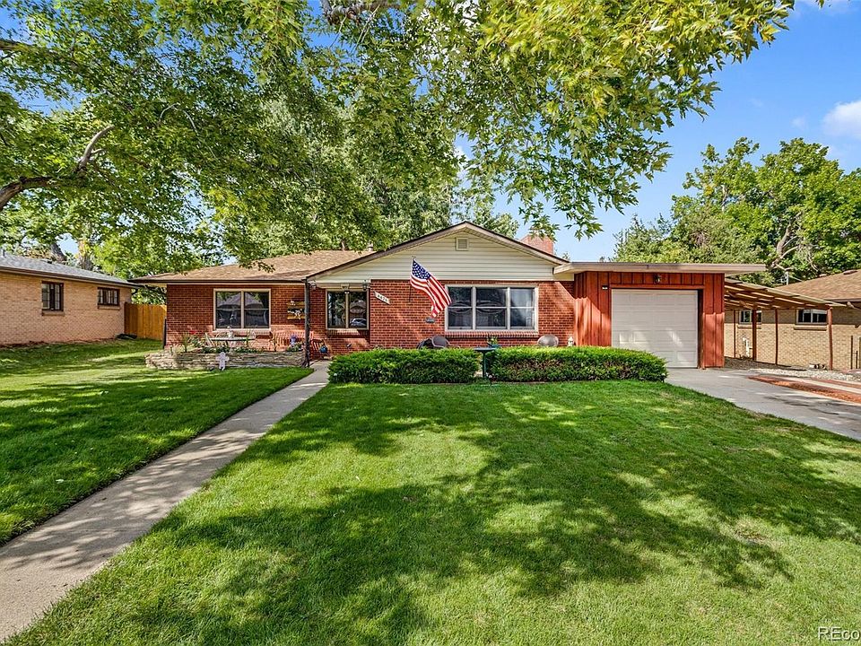 Beautiful Ramblin' Ranch with Mid-Mod Features in Wheat Ridge! This Home has Great Character and curb appeal! Upon entry you will be greeted by a large living room with wood-burning fireplace. Nice flowing floorplan with almost 1700 square feet of Living Space. We Truly have a Chef's Kitchen with Beautiful Cherry Wood Cabinets, Gorgeous Granite Counter-tops, and beautiful Stainless-Steel appliances including a Gas Stove! Lazy Susan's, Pull-out Spice Rack and Pan Rack complete this Space! Eating Space in the Kitchen, in addition to a Formal Dining Room complete with Chandelier! The Dining Room opens onto a Sunroom overlooking the large back yard. The home has beautiful Wood floors through-out and Tile in the kitchen. All 4 Bedrooms are easily accessible with everything being on one floor. A one-car attached garage plus a 2-car Tandem attached Carport for your vehicles or toys! This home is surrounded by mature trees, level yard, and has a wonderful Front Patio for hanging out in! Newer Furnace, Central Air, and Roof for your peace of mind too. Easy commute to the city or foothills. Shopping and entertainment are nearby. Nothing to do except move in and call it home! You'll be glad you made this one yours for years to come!
