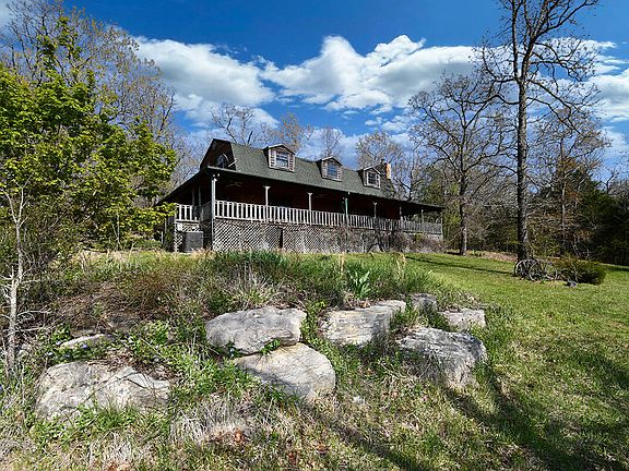Luxury Home on 121 Acres -- Prime hunting and outdoor recreation property - Come home to this remote haven of natural beauty spread out over 121 acres at the foot of the majestic Ozark Mountains. Whether as your primary residence or private weekend retreat, you'll have front-row seats to the best nature has to offer, from the panoramic views of rolling hills to afternoons fishing in the spring-fed lakes to rejuvenating strolls through specular trees. Plus, with its location less than 30 min. from Hwy 65, you can make it home from work in time to end every day enjoying breathtaking sunsets from the comfort of your wraparound porch. The one-of-a-kind, 2-story house was intentionally designed to blend into its incredible setting. The open floor plan, wide-plank wood flooring, vaulted ceilings with wood beams as well as custom extras like its sealed-wood countertops and stone accents create a warm, relaxing lodge-like setting. Picture yourself gathering with family and friends in front of the stone fireplace, shooting a game of pool on the table that stays with the home or enjoying a home-cooked meal at the kitchen island bar. The main bedroom suite with a full bath is conveniently located on the main floor as is the laundry room and a half bath. Upstairs, kids and guests can lounge in the loft-style living room that overlooks the main floor, and the 2 bedrooms and full bath add extra privacy as well. Much of the perfectly placed furniture stays with the home, including log bunk beds that will make this every kid's favorite sleepover destination! This incredible property, which borders a 500+/- acre tract of Mark Twain National Forest on 2 sides, offers hobbyists and outdoor enthusiasts endless options year-round. A detached workshop comes with electricity as well as inspiring views of the lake. Enjoy extensive trails by foot or with ATVs, prime hunting opportunities from several fixed tree stands and the stocked 1.5-acre lake. The metal outbuilding offers extra storage.