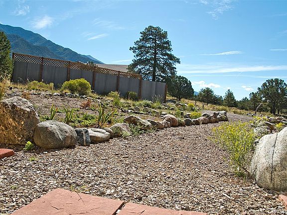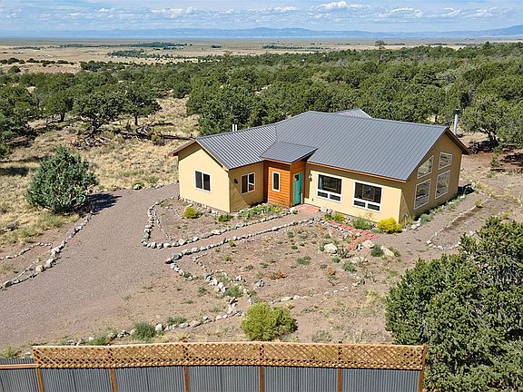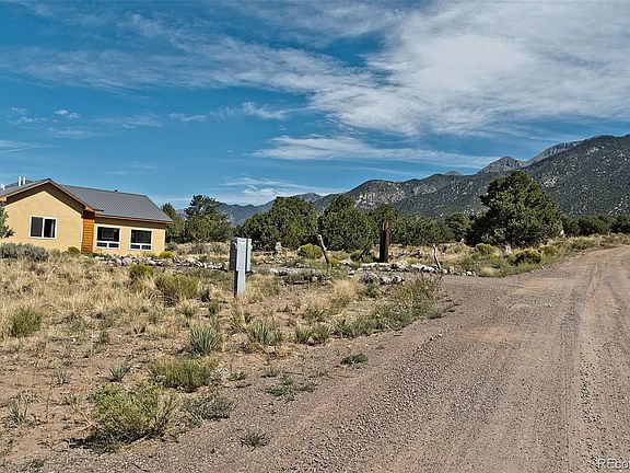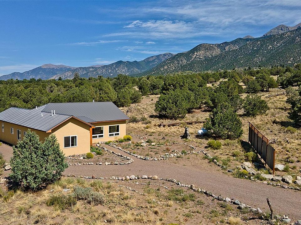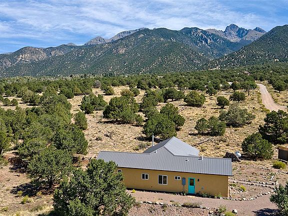 This stunning, modern 1603 sq ft custom home, built by local builder Sun Peak Builders in the farthest edge of the Baca Grande Neighborhood and abutting a huge greenbelt, was designed to capture the magnificence of the mountains through the huge, sun filled windows. With little need for artificial light, this single story 3 BD/2 bath home was built to capture the surrounding beauty but also remain energy efficient. Four in-floor radiant heat zones heat the house nicely on custom-stamped concrete and tile, while the oversized windows not only allow for spectacular views, but also passive solar heat gain, and the wood burning Lopi stove provides the extra crisp heat on cold winter days. Additional energy efficient elements include spray foam insulation with high R-values and an on-demand hot water heater, as well as low maintenance stucco exterior and metal roofing. The centerpiece of the home is the stunning kitchen, designed with custom wood cabinets, stainless steel appliances, a large pantry and an oversized 9' quartz island, perfect for entertaining, cooking, and serving. Just off of the great room sits a large private outdoor patio, facing the expansive greenbelt and mountains. The light-filled private primary suite continues the expansive views from the great room into the private quarters, and includes a large walk-in closet, and a full bath with a deep soaking tub and built in cabinets. The additional two bedrooms on the other side of the house each feature double door closets and share a 3/4 tiled bathroom. A convenient laundry/utility room provides additional access to the outside. A quick 7.8 mile drive to the Town of Crestone for groceries, gas, and much more. Don't forget to check out the virtual tour to experience the house and see many more of the details (especially check out the views from each window!!) that make this house a rare, beautifully built find in Crestone!