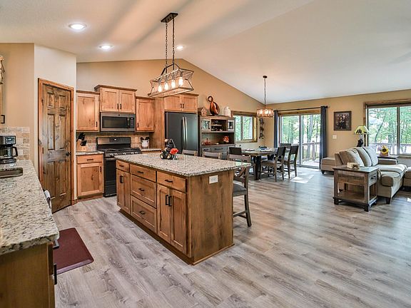 This three-bedroom, three-bath home, built in 2021, offers serene living in a quiet rural environment with picturesque views and 300 feet of waterfrontage on Camp Lake. The main level features stunning woodwork, a custom kitchen with granite countertops, a newly finished walk-out basement, and a beautifully designed bathroom in the main floor primary bedroom. Enjoy the warmth of two stone front gas fireplaces and the convenience of a large attached insulated 4-car garage. The property boasts new landscaping and many upgrades, making it an ideal custom home in a private setting. Schedule your private viewing today for a closer look.
