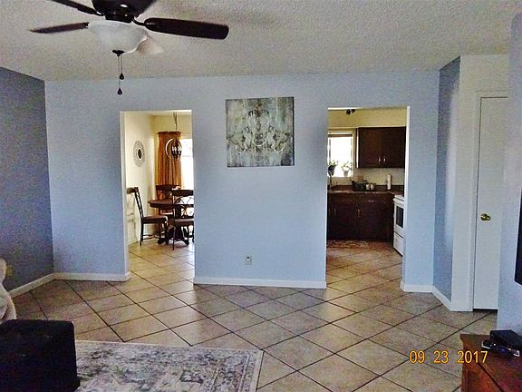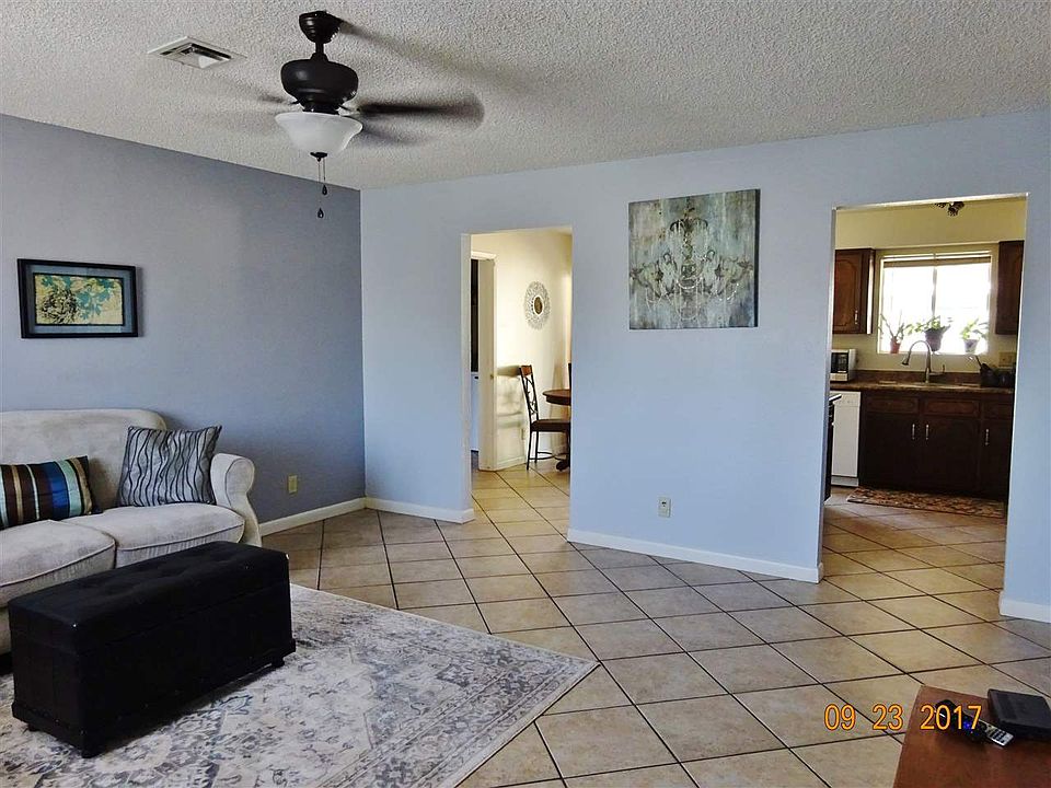Super cute, clean, updated, and well maintained home. Lot's of natural light and good vibes. Ceramic tile laid diagonally in all home except for 3 bedrooms. Kitchen with breakfast bar, upgraded appliances, deep stainless sink, and dishwasher. Upgraded lighting, countertops, fixtures and so much more. Doors open to extended covered patio and block fenced back yard. Double side gates for RVs, boats, etc. Independent indoor laundry room with a/c. Large extra tiled room with own entrance could be 4th bedroom