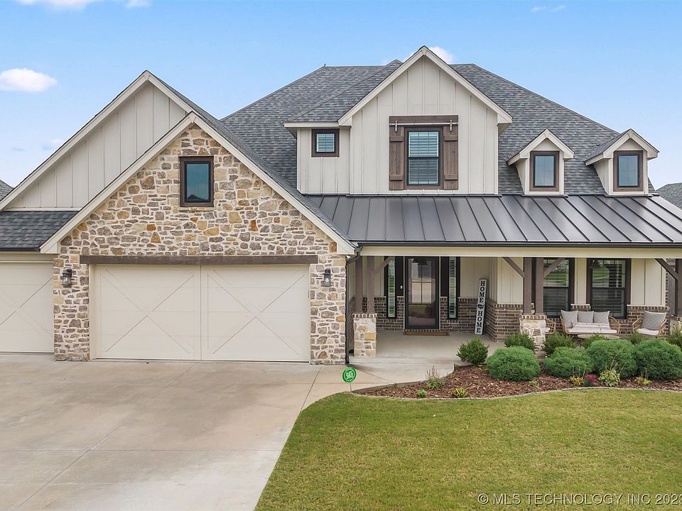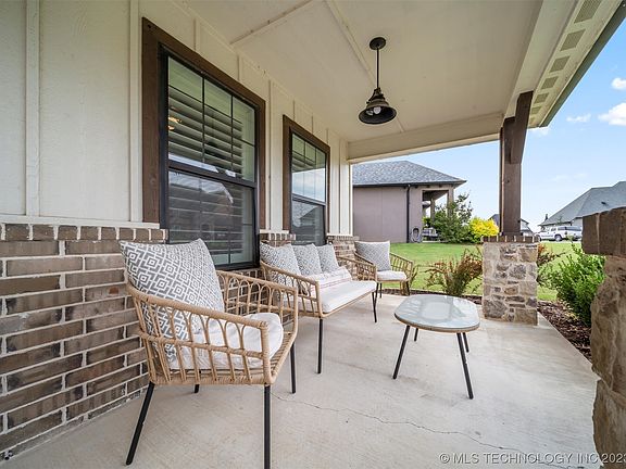 Beautiful Yorktown in Bixby School district, nestled in city of Jenks! With park, pool, clubhouse, trails, ponds and more, this is a community you can belong to! The house was built in 2019 by Beacon Homes and features a modern yet rustic exterior with a beautiful, large front porch! Wood floors and light walls greet you and draw you into the heart of the home past a downstairs guest suite with private bathroom and a designated office area. The living room has an entire wall of windows, wood ceiling beams and an open concept into the kitchen and dining area and beautiful fireplace with floor to ceiling detail. Kitchen has a spacious island has bar seating and a large dining area surrounded by windows to the gorgeous exterior patio. Oversized back patio with pergola, brick fireplace and hot tub will make you want to come and stay! Designer color palette, stainless steel appliances, a drop zone off garage, plus a built in desk area. Master bedroom is downstairs with en suite bathroom including two sinks, spacious shower and separate soaker tub, plus a walk in closet! A 2nd guest room with private en suite off entry; spacious laundry room with lots of cabinetry as well as a half bathroom complete the downstairs. Two more bedrooms and a full bathroom upstairs. Great attic space for storage as well as a 3 car garage with EV charging station and a storm shelter. Fully fenced yard and ready for move-in! Close to highways, shopping, dining, and more!